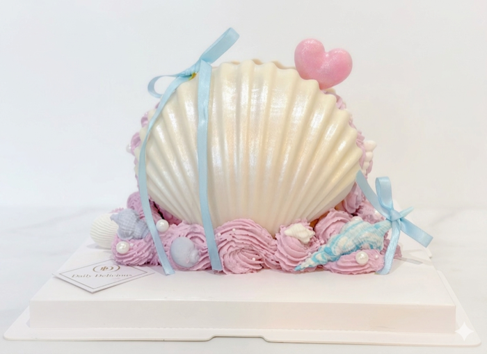 This cake is available in eight flavours. Please pick a flavour below for your order. The shells are made from chocolate. The hearts and conch are made from Fondant. The colours are customizable, please let us a note!